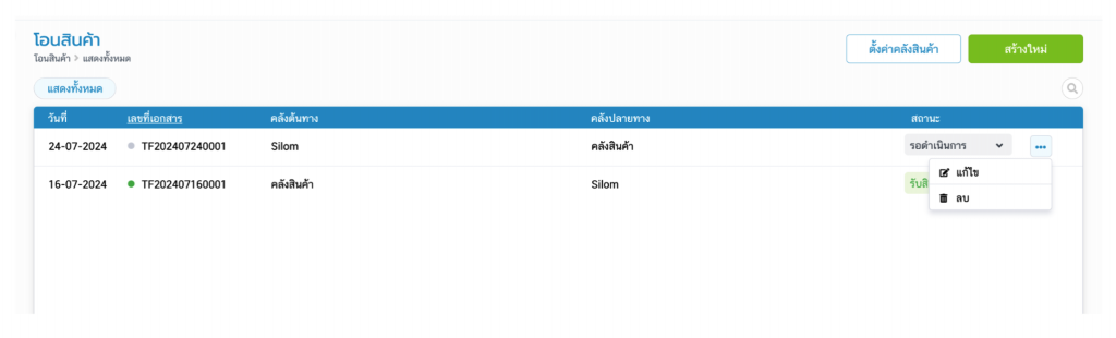 ไปที่เมนูสินค้า > โอนสินค้า > กดจุดสามจุดใบโอนสินค้าที่ต้องการ > แก้ไข