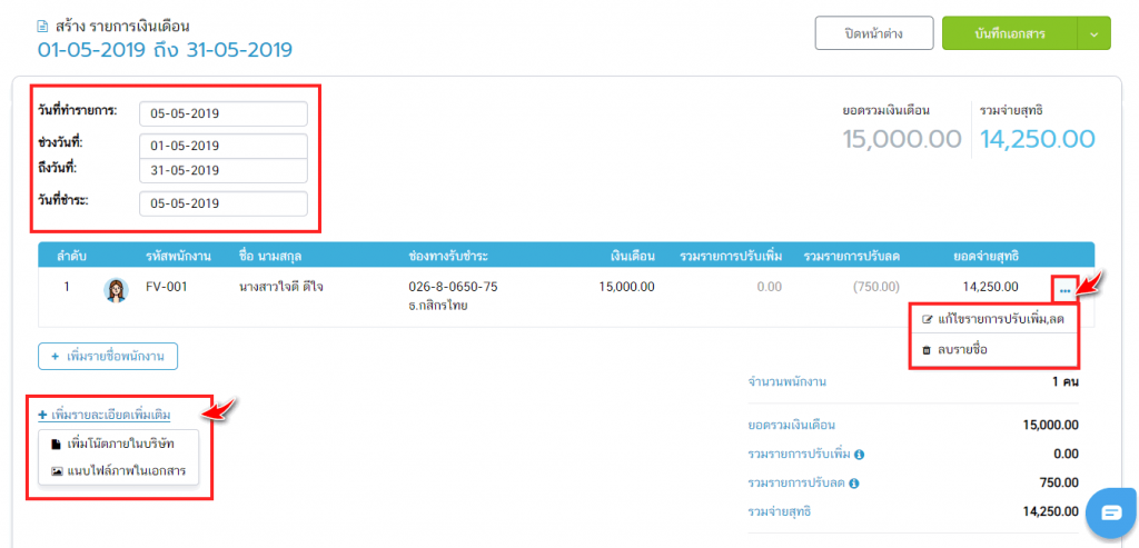 4.เข้าที่เมนูรายการเงินเดือน/ค่าจ้าง เพื่อเริ่มสร้างรายการจ่ายเงินเดือน สามารถเลือกรอบวันที่จ่ายและวันที่จ่ายเงินเดือนได้ รวมถึงแก้ไขรายการปรับเพิ่ม-ลด และเพิ่มโน้ตต่างๆ ได้