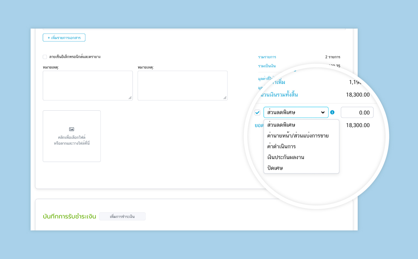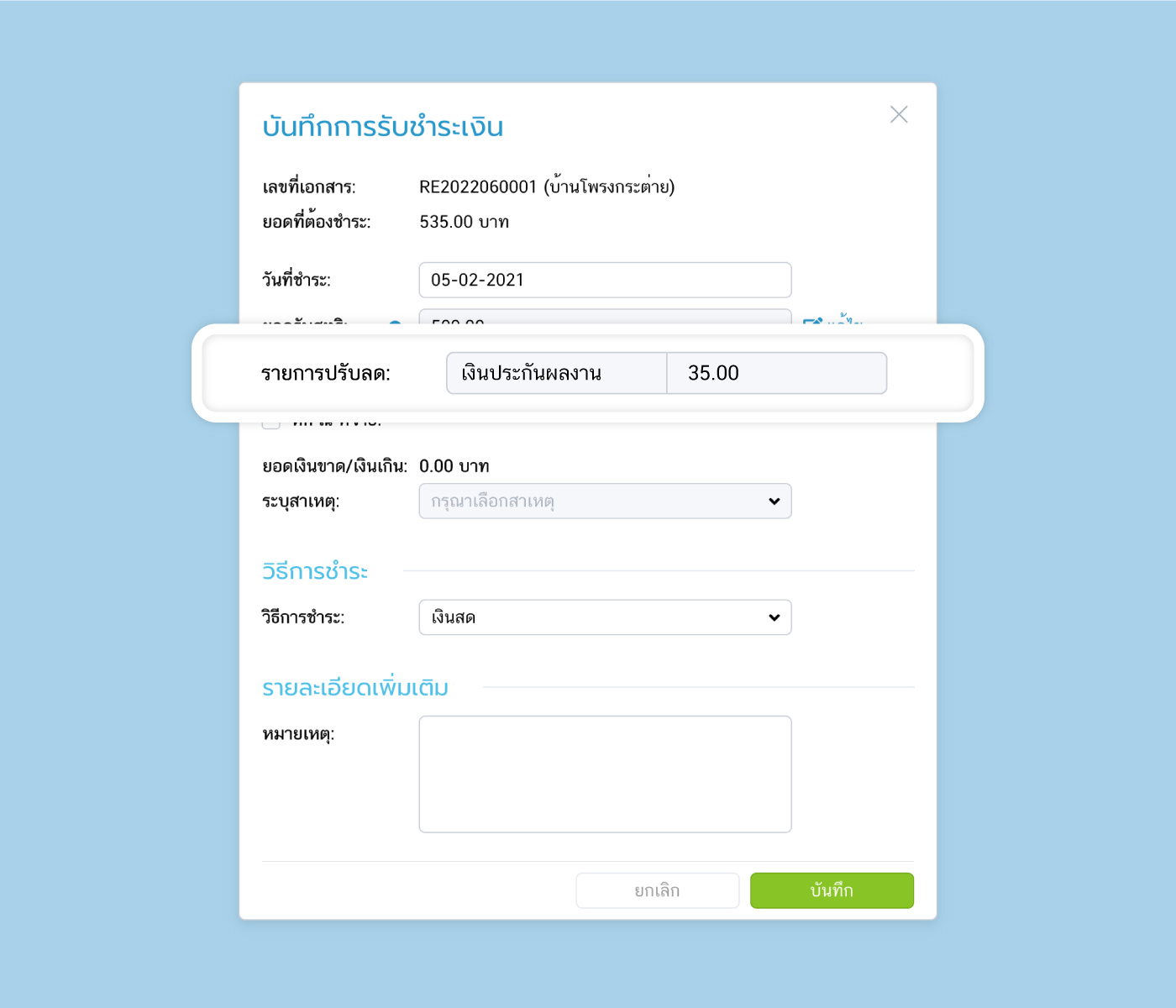 การรับเงินในกรณีที่ผู้จ่ายเงินมีการหักเงินจำนวนหนึ่งไว้ เช่น เงินประกันผลงาน, ค่าดำเนินการ หรือมีการให้ส่วนลดพิเศษในการรับเงินแต่ละครั้ง สามารถแสดงการหักดังกล่าวในเอกสารใบเสร็จรับเงินได้ง่ายๆ และระบบจะบันทึกบัญชีให้อัตโนมัติ ซึ่งสามารถระบุรายการปรับลดนี้ได้ที่เอกสาร “ใบเสร็จรับเงิน”, “ใบกำกับภาษี/ใบเสร็จรับเงิน”
