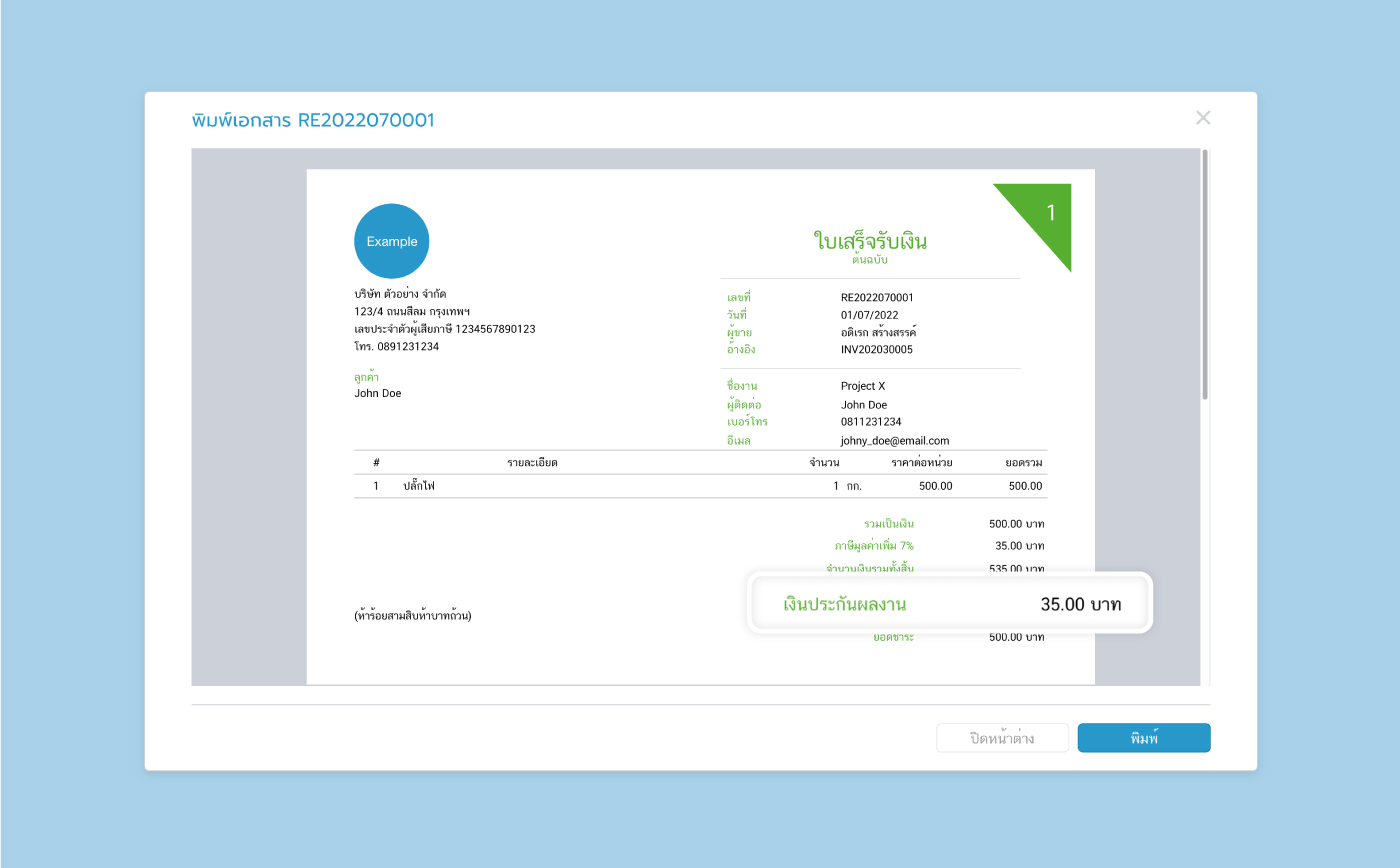 - สร้างเอกสารเพื่อรับเงิน กรณีนี้ขอยกตัวอย่างเอกสาร “ใบกำกับภาษี/ใบเสร็จรับเงิน” ในเมนูขายเงินสด โดยคลิกเลือกรายการปรับลด “เงินประกันผลงาน” กรอกจำนวนเงินที่ถูกหัก เอกสารจะคำนวณยอดรับชำระหลังหักรายการปรับลดให้ในบรรทัดสุดท้าย