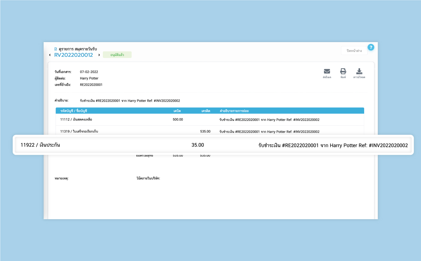 - เมื่อทำการคลิกเก็บเงิน ระบบจะดึงรายการปรับลด “เงินประกันผลงาน” มาแสดงเป็นยอดหักให้ และบันทึกบัญชีอัตโนมัติ